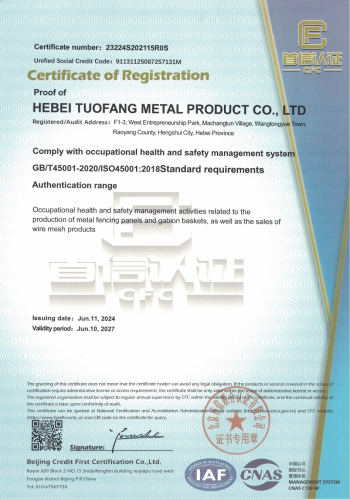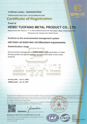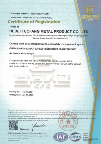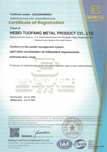 Tuofang Metal Product Co., Ltd. расположен в крупнейшей производственной базе Wire Mesh - Anping County, родном городе Wire сетки во всем мире. Теперь мы являемся одним из ведущих производителей проволочных сетей. С разумными ценами и хорошими услугами мы получили признание и доверие среди клиентов по всему миру. Наши основные продукты - это все виды продуктов из проволочной сетки, в том числе Gabion Box, 358 забор, барьеры HESCO, сетчатое боевое ограждение, ограждение с тяжелыми условиями, сварная сетка, забор в аэропорту, шип на стене, забор цепи, ворота лошадей, палисадский забор, временный забор, забор в форме персика и т. Д. Почему мы выбираем? Tuofang Metal Product Co, Ltd. Интегрирует исследования, разработки, производство, продажу, продажу, продажу и послепродажную службу. Мы являемся одной из комплексных компаний по производству продуктов металлов в этой области.